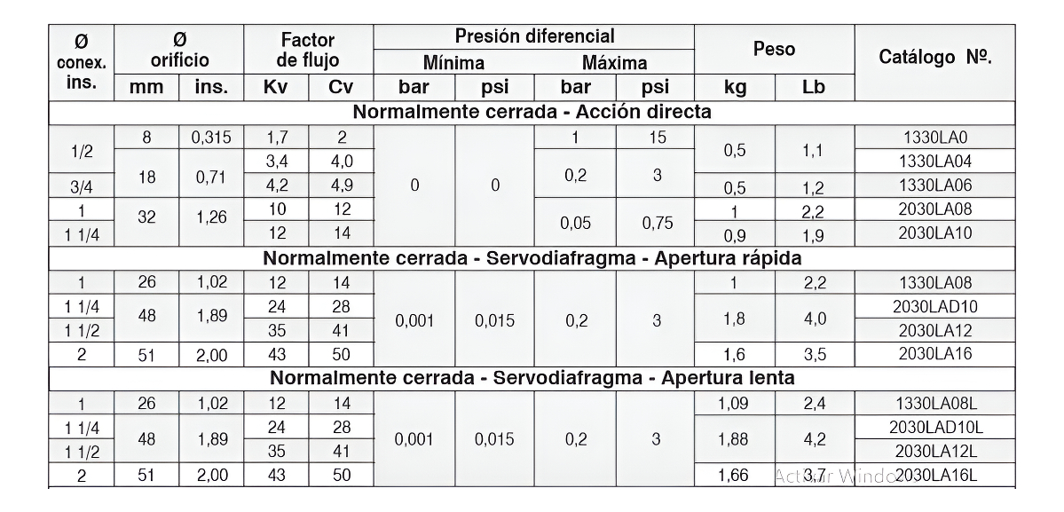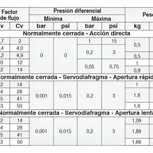 Asientos y diafragma de Buna N. Bobina capsulada. Conexión ISO 4400 / EN 175301-803 (Ex DIN 43650) forma A. Protección IP65 y NEMA 4x. Apertura rápida o apertura lenta regulable hasta 10seg. Cierre en menos de un segundo. Opcional: microcontacto de prueba de válvula cerrada.